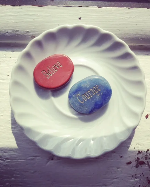 on wednesday, after my visit that i could barely sit through, i left her office and walked outside to unlock my bicycle and get on home. right near my bike there were two stones engraved with a message. one read, "believe" in orange stone and the other read, "courage" in blue stone. funnily, i picked up both and tossed "courage" back on the earth. convincing myself that i didn't need it. i didn't need courage. and then i picked it back up with a sweet smile in my heart because i knew these were messages i needed today. and always.